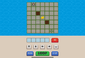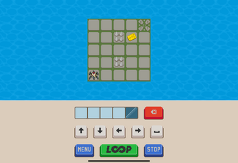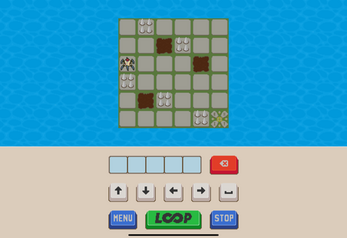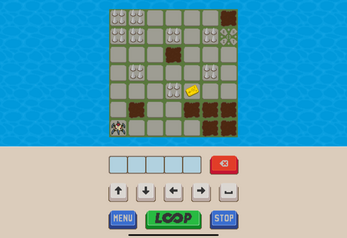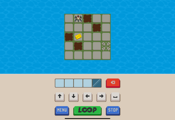 Enter the instructions. Press LOOP. The little robot will loop through your instructions. Get the key card and reach the exit. Avoid the spikes and the tar pits. And don't fall off the edge.
